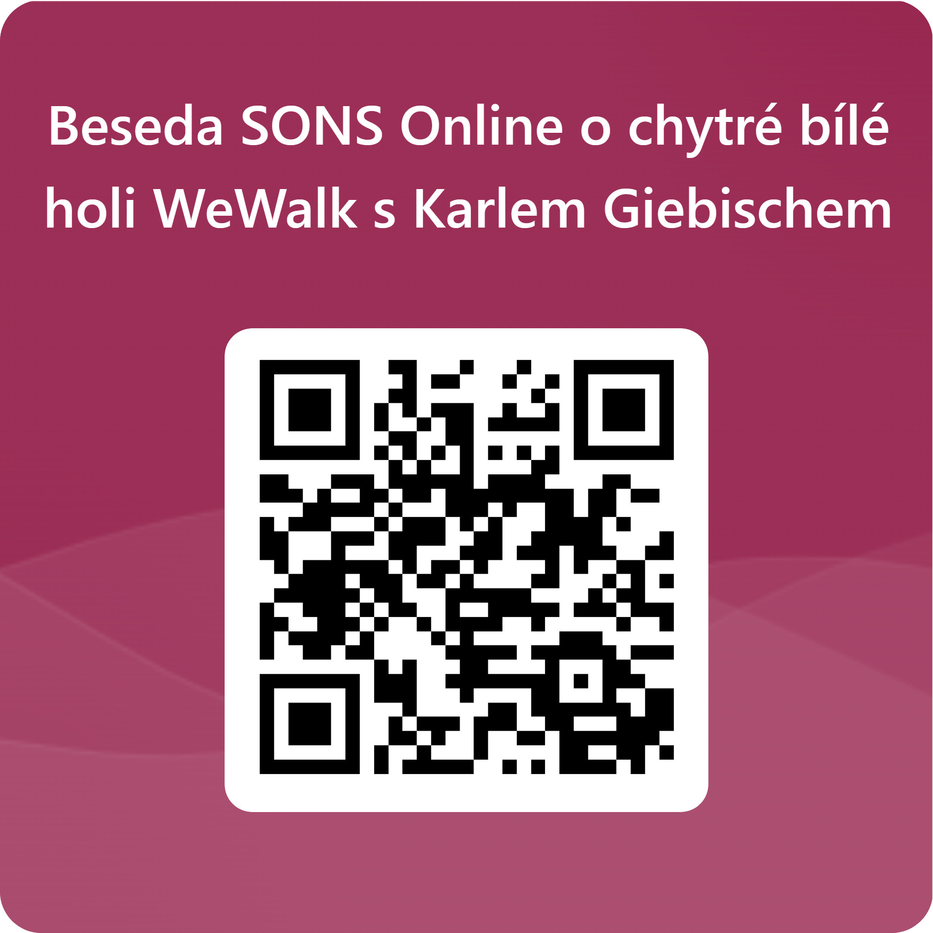 Vážení přátelé, posílám pozdravy a přání zdraví, pokoje a úspěchů pro celý letošní rok 2026 od všech pracovníků zapojených v SONS Online. První dvě lednová setkání máme již za sebou, ale čekají nás ještě další dvě. A to: * v úterý 20. ledna od 17:00 hodin odstartuje další Trénink paměti, * přihlášení: https://1url.cz/@26-01-trenink-pameti-prihlaska * a ve středu 28. ledna také od 17:00 hodin začne Beseda o chytré bílé holi WeWalk s Karlem Giebischem * přihlášení: https://1url.cz/@26-01-beseda-WeWalk-prihlaska Všem přihlášeným posíláme odkaz na online schůzky v aplikaci Teams a to nejpozději hodinu před jejím začátkem. Přihlásit je možné se na odkazech výše, nebo načtením přiloženého QR kódu. Podrobnější informace k setkáním najdete v přiložených pozvánkách nebo na webu: https://www.sons.cz/online Pokud jste některou schůzku nestihli, pořizujeme z besed nahrávky. Ty najdete na našem YouTube kanálu. Začnete-li navíc náš kanál odebírat, obdržíte informaci o nově zpracované nahrávce hned mezi prvními: https://www.youtube.com/@sonsonline3028 S přáním všeho dobrého i se SONS Online Petr Jasinský -- Petr Jasinský Administrativní pracovník, technická podpora, koordinátor dobrovolníků a SONS Online Sjednocená organizace nevidomých a slabozrakých ČR, z. s. Oblastní pobočka Nový Jičín Sokolovská 617/9 741 01 Nový Jičín Tel: +420 778 768 381 E-mail: petr.jasinsky@sons.cz<mailto:petr.jasinsky@sons.cz> www.sons.cz<https://www.sons.cz>, www.bilapastelka.cz<https://www.bilapastelka.cz>