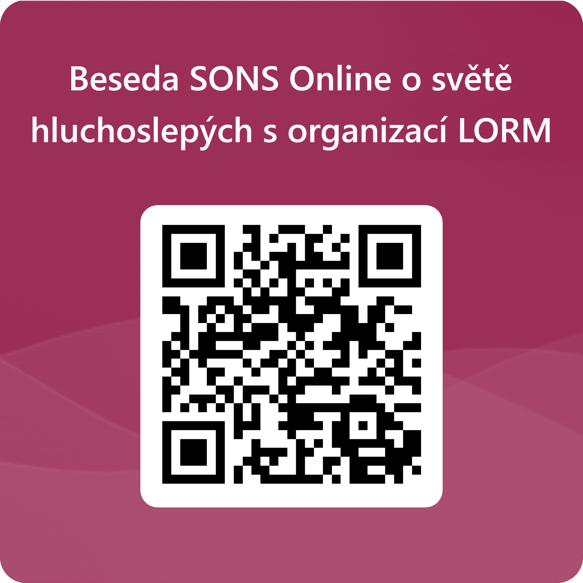 Drazí přátelé, společně s Hankou Petrovou Vás srdečně zveme na další online setkání, tentokrát na téma, které propojuje světy ticha a tmy. * Ve středu 25. února od 17:00 proběhne beseda s pracovnicemi organizace LORM – Společnost pro hluchoslepé z.s., * přihlášení: https://1url.cz/@26-02-beseda-s-LORM Všem přihlášeným pošleme odkaz na online schůzku v aplikaci Teams a to nejpozději hodinu před jejím začátkem. Přihlásit je možné se na odkazu výše, nebo načtením přiloženého QR kódu. Podrobnější informace k setkání najdete v přiložené pozvánce nebo na webu: https://www.sons.cz/online Pokud jste některou schůzku nestihli, pořizujeme z besed nahrávky. Ty najdete na našem YouTube kanálu. Začnete-li navíc náš kanál odebírat, obdržíte informaci o nově zpracované nahrávce hned mezi prvními: https://www.youtube.com/@sonsonline3028 S přáním všeho dobrého a na slyšenou se SONS Online se těší Petr Jasinský -- Petr Jasinský Administrativní pracovník, technická podpora, koordinátor dobrovolníků a SONS Online Sjednocená organizace nevidomých a slabozrakých ČR, z. s. Oblastní pobočka Nový Jičín Sokolovská 617/9 741 01 Nový Jičín Tel: +420 778 768 381 E-mail: petr.jasinsky@sons.cz<mailto:petr.jasinsky@sons.cz> www.sons.cz<https://www.sons.cz>, www.bilapastelka.cz<https://www.bilapastelka.cz>